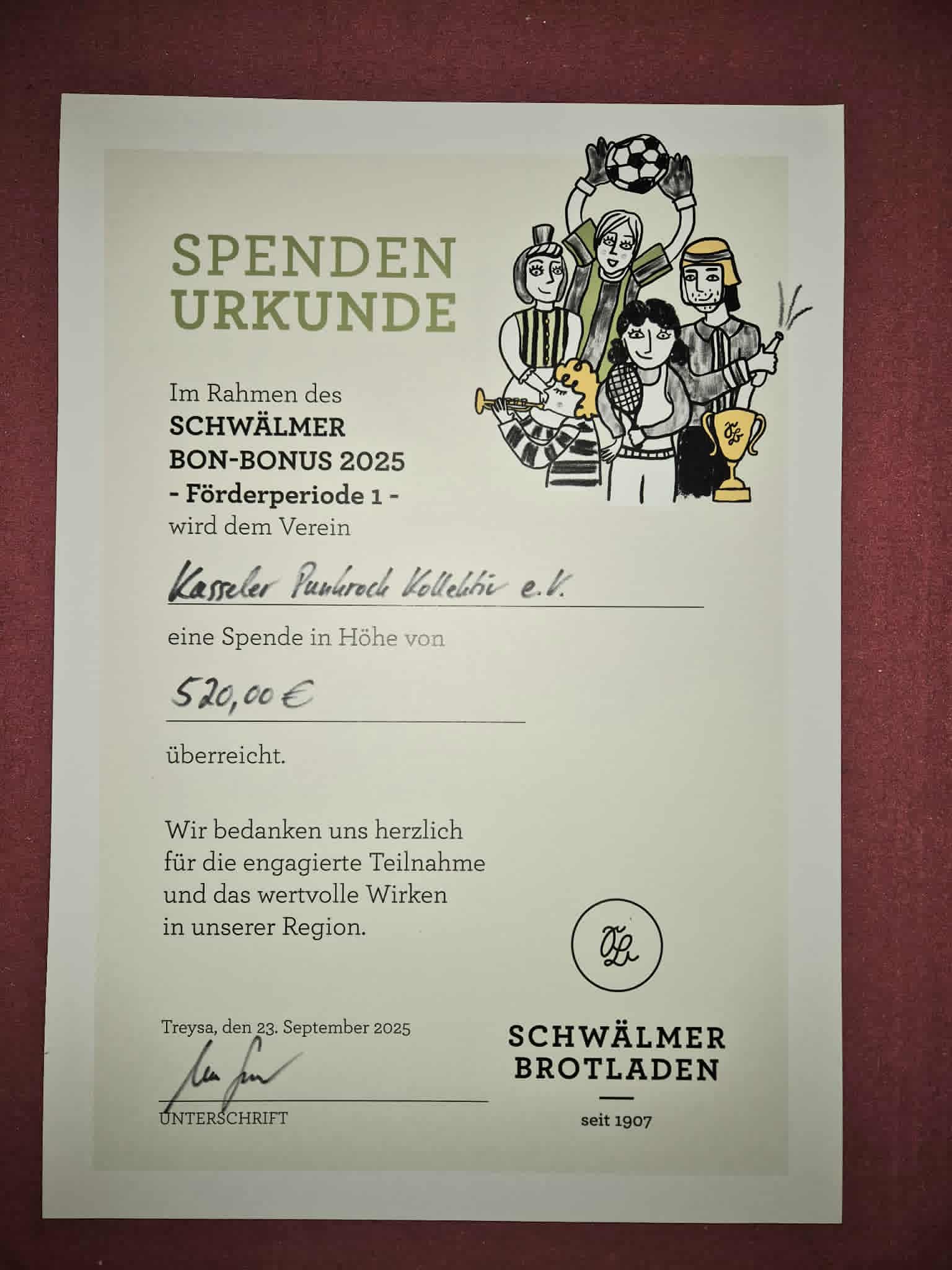 Am 23. September 2025 waren wir zur Spendenübergabe in den Schwälmer Brotladen in Schwalmstadt eingeladen. Und dank eurer gesammelten Quittungen sind unglaubliche 520 € für unseren Verein zusammengekommen! Ein riesiges Dankeschön an alle, die fleißig mitgemacht haben – und natürlich an den Schwälmer Brotladen für die tolle Aktion! Wir sind direkt für die zweite Spendenrunde registriert, daher sammelt bitte fleissig weiter eure Quittungen und reicht diese bei uns ein. Das geht auf dem Postweg oder direkt in der Goldgrube. Jede einzelne hilft! Gemeinsam halten wir die Subkultur am Leben!