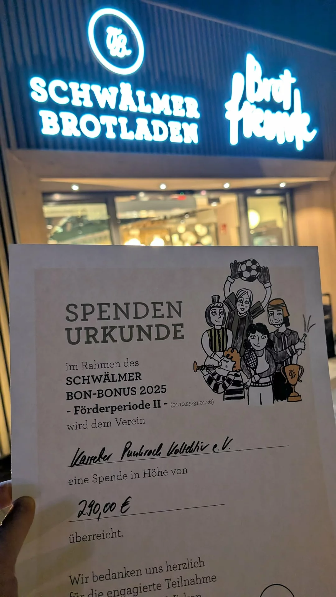 Am 24. Februar 2026 waren wir zum zweiten Mal eingeladen, um eine Spende des Schwälmer Brotladen in Empfang zu nehmen. Dieses Mal kamen dank Eurer Unterstützung 290 € zusammen, die selbstverständlich dafür verwendet werden, Kassel laut zu machen. Bei der Veranstaltung wurde die dritte Runde angekündigt, und natürlich sind wir bereits registriert. Drückt uns die Daumen für die Auslosung und vor allem: Sammelt fleissig weiter Quittungen der Brotladenfiliale Eures Vertrauens. Jeder Bon hilft.
